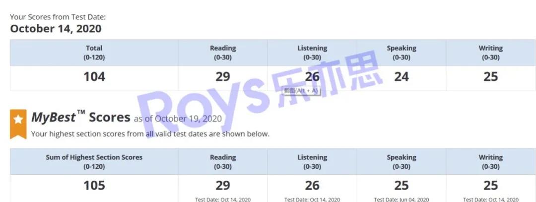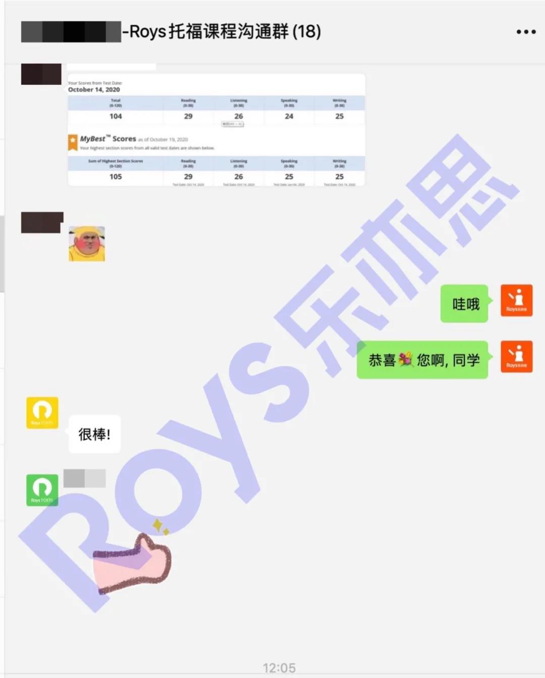 Roys樂(lè)亦思托福課程學(xué)員實(shí)現(xiàn)96到104的跨越