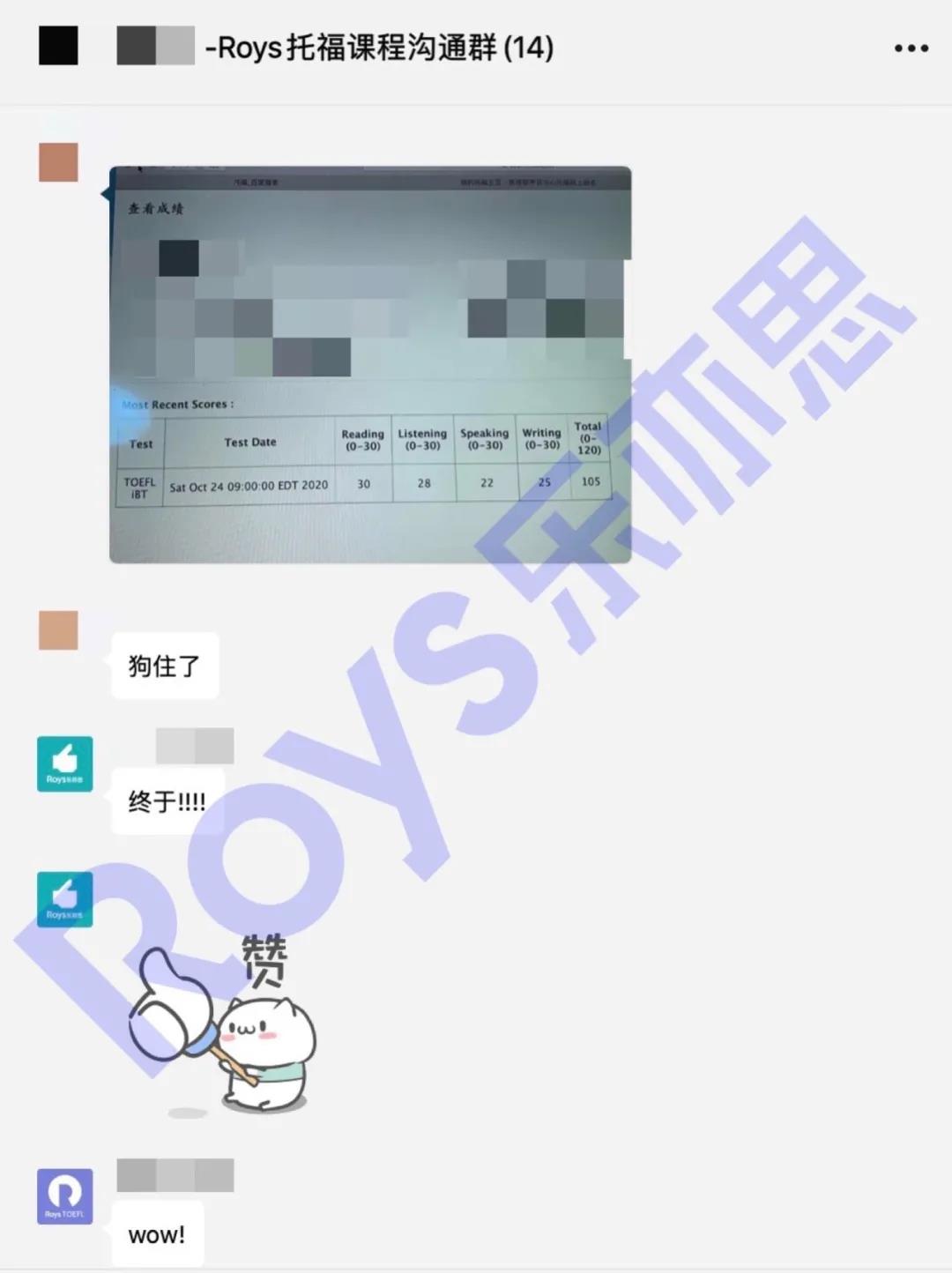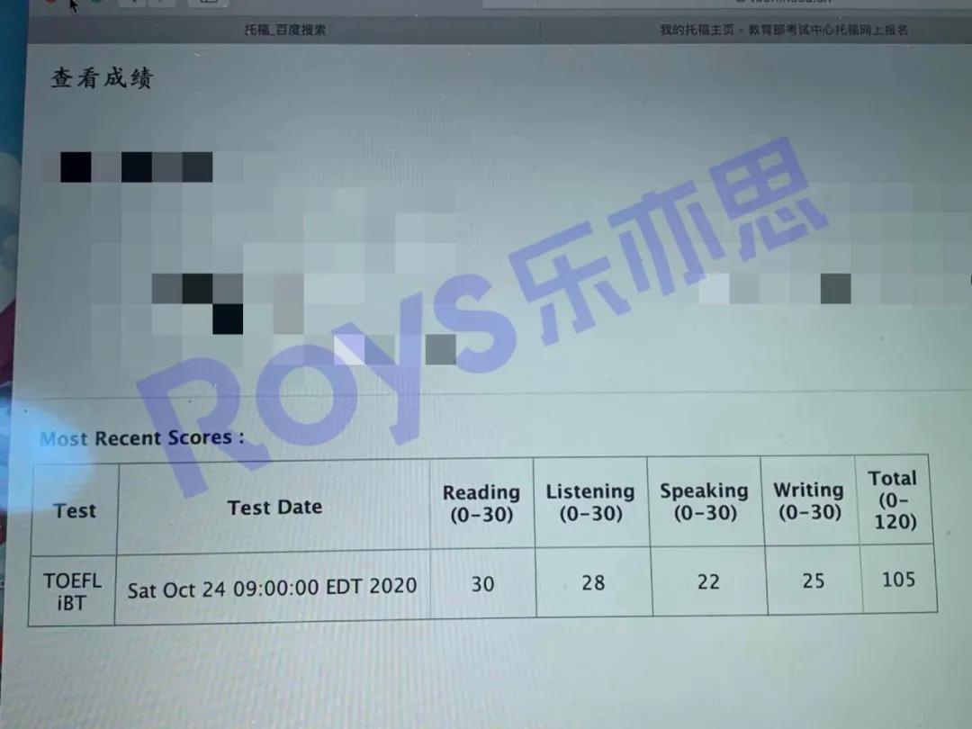 Roys樂亦思托福課程學(xué)員實(shí)現(xiàn)75到105的跨越