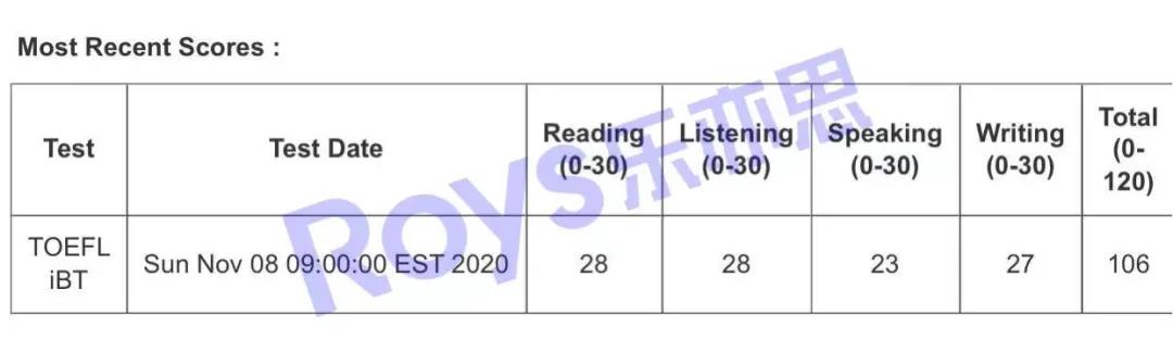 Roys樂(lè)亦思托福課程學(xué)員實(shí)現(xiàn)100到106的跨越