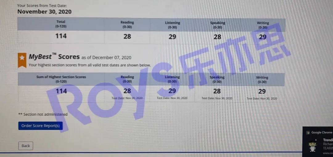 Roys樂亦思托福課程學(xué)員實現(xiàn)97到100的跨越