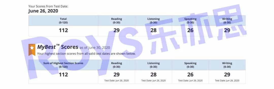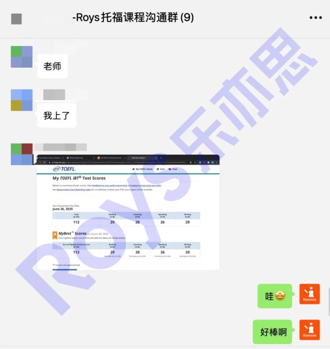 Roys樂亦思托福課程學員培訓29天進步37分,獲112高分