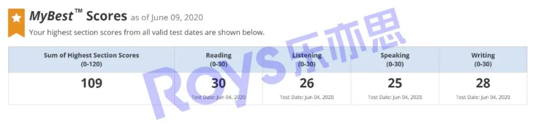 王同學(xué)在參加融合班課和一對(duì)一課程集訓(xùn)后, 參加6月5日線上托??荚?/span>, 獲得了總分109的好成績(jī), 閱讀滿分, 口語順利拿下25分,