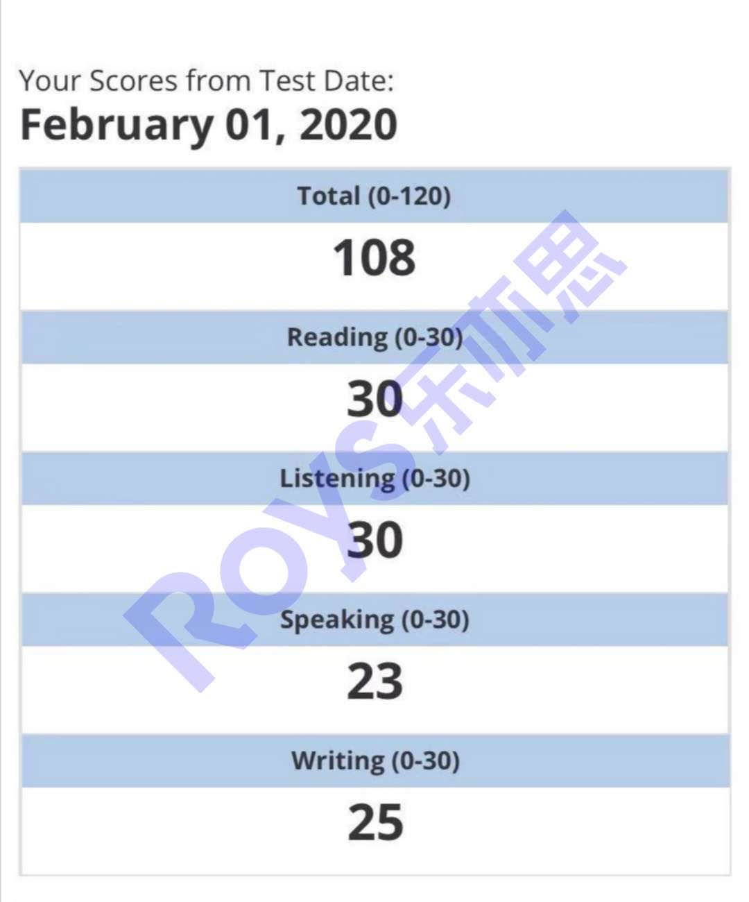 恭喜Roys樂亦思托福的杜同學(xué),經(jīng)過集訓(xùn)完成了從87分到108分的跨越,斬獲閱讀聽力雙滿分,總成績108分的好成績??!