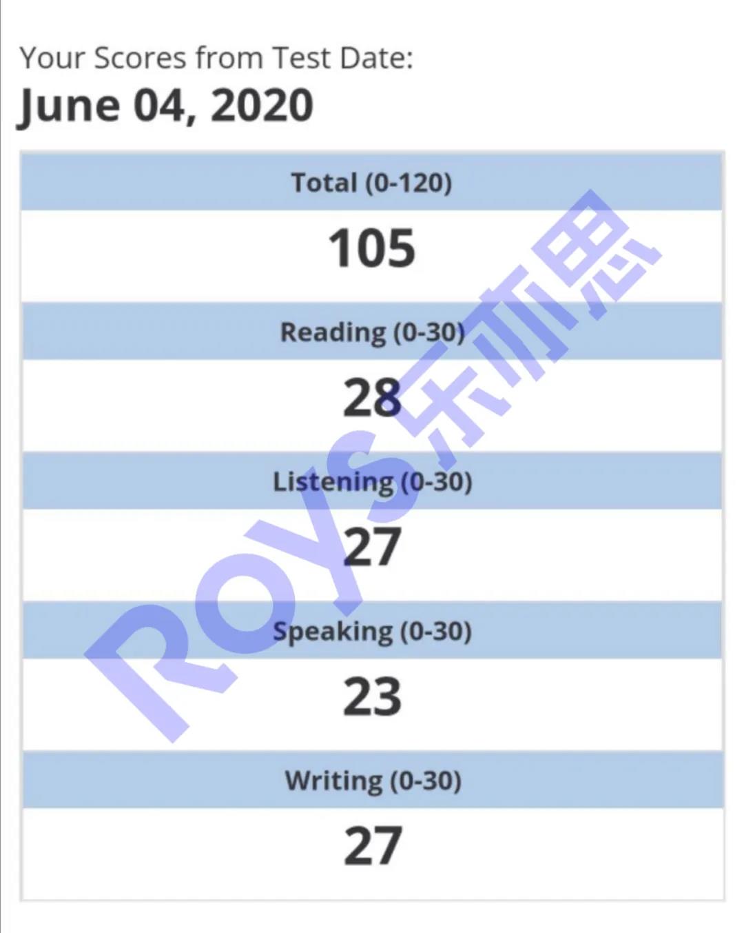 王同學(xué)經(jīng)過樂亦思托福一對(duì)一視頻課程集訓(xùn), 參加6月5日線上托福真考, 順利破百, 拿下105的好成績. 感謝各位老師的指導(dǎo), 最應(yīng)該感謝的是自己的努力與付出.