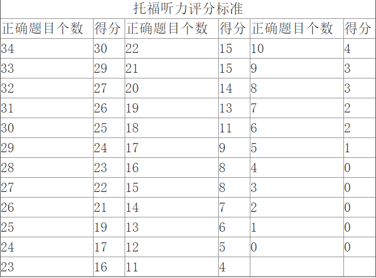 托福聽力一共是6篇文章,34道題,總分卻是30分。因此聽力得分是有一個托福聽力評分標準的。(詳情見下圖)